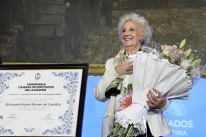 La titular de Abuelas de Plaza Mayo, Estela de Carlotto, recibió este miércoles en la Cámara de Diputados la «Mención de Honor Juan Bautista Alberdi» por su compromiso en la defensa de los derechos humanos.