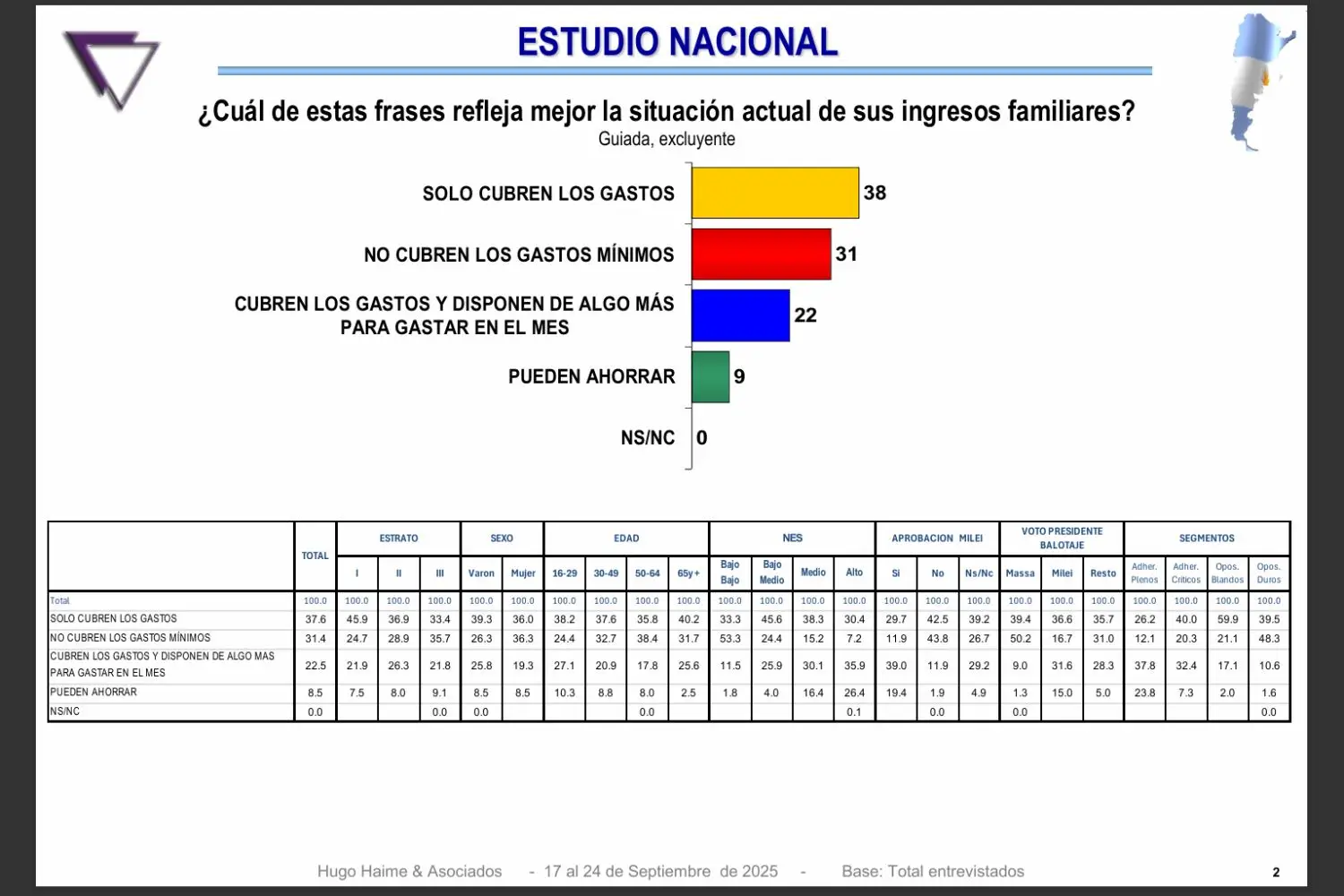 En la encuesta de Haime, casi un 70% de los consultados dijo que sus ingresos no le alcanzaban a cubrir los gastos (31%) o que apenas los cubrían (38%). En el caso de Management & Fit, las dificultades para cubrir los gastos subieron un 3,7% respecto a agosto. «Uno de cada dos no llega a fin de mes y ocho de cada diez cambiaron los hábitos de consumo», señaló Lara Goyburu, directora de M&F en Futurock. Agregó que esta preocupación era mucho más alta entre los mayores de 40 años, que en mayoría ya tienen gastos familiares que mantener, a diferencia de los más jóvenes que no tienen esa preocupación. Otro dato que se modifica mes a mes es que, como es lógico, cada vez son más quienes responsabilizan a Milei de la situación económica (60%) que al ya más lejano gobierno de Alberto Fernández.