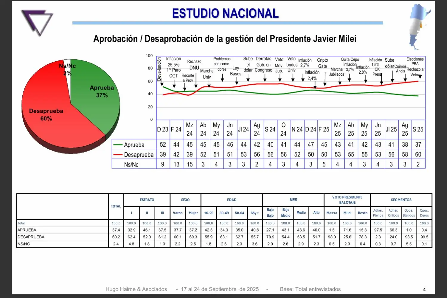 En el sondeo de Hugo Haime y Asociados, la aprobación de gestión fue de 37% y la desaprobación de 60%. En Synopsis, de 36,3% a 58%. En la medición que hace la Universidad de San Andrés, la aprobación del gobierno bajó tres puntos en el último mes y quedó en 39%, con un 58% de rechazos. Todos números muy parecidos que coinciden en que un aval a Milei ya situado por debajo del 40%, antes de que se iniciara el nuevo escándalo del oficialismo que involucra a Espert. Es notorio cómo la corrupción volvió a instalarse como el principal tema de preocupación de los argentinos. Antes, eso era buena noticia para la Casa Rosada porque tenía que ver con el kirchnerismo. Desde el caso $LIBRA, los audios de Diego Spagnuolo y ahora Espert, la corrupción pasó a ser distintivo de La Libertad Avanza.