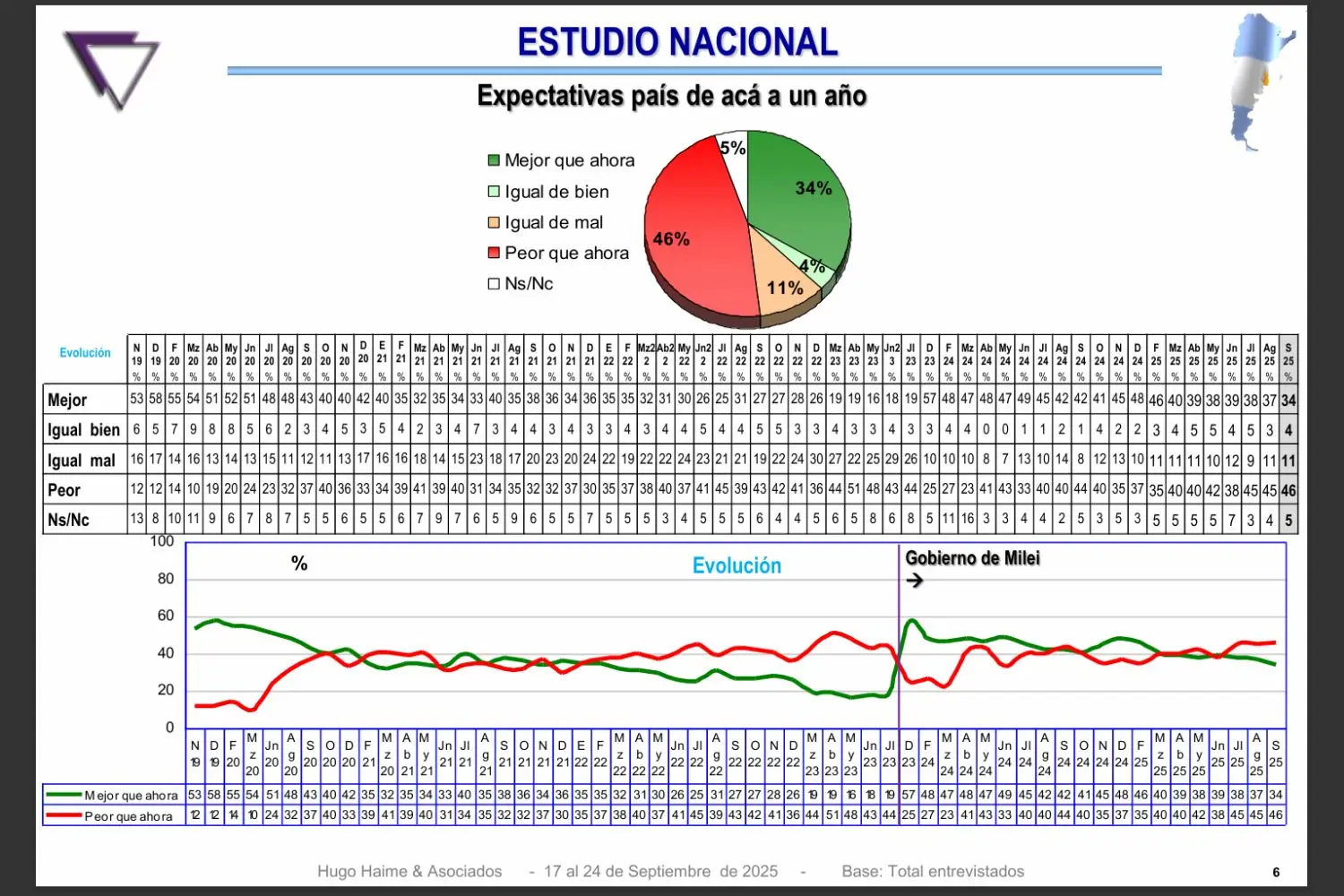 A los efectos del posible voto del domingo 26, un indicador clave tiene que ver con las esperanzas. Lo que los electores creen que sucederá en el país y en su situación personal de aquí a un año. En el primer tramo de la gestión Milei, como es lógico, la mirada esperanzadora superaba la visión pesimista. El enorme 56% que lo respaldó en el balotaje mantenía su apuesta a que el voto resultaría positivo. Pero, desde julio pasado según el sondeo de Haime, ya decidamente son más los pesimistas que los optimistas en su mirada respecto a la situación del país de acá a un año, y esa mirada se acentúa mes a mes. En septiembre, sólo un 34% respondió que Argentina estará mejor en 2026 mientras que un 46% dijo que estará peor, una desmejora de cuatro puntos respecto a agosto. «El apoyo de Estados Unidos a Milei se ve inocuo ante esta realidad», apuntó Facundo Nejamkis, director de Opina Argentina.