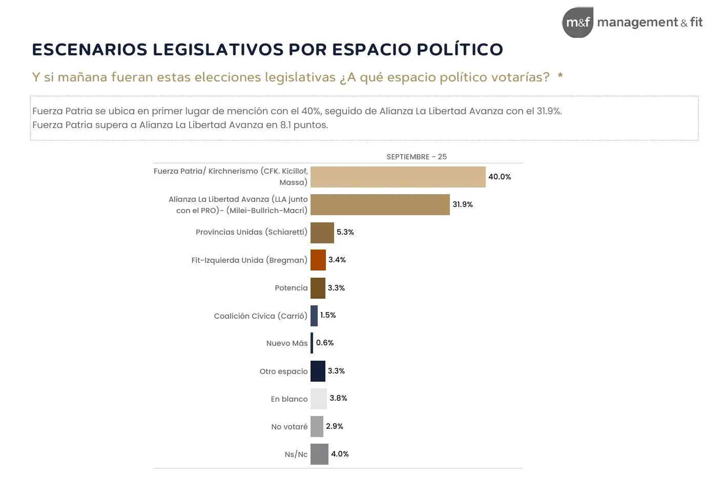 Respecto a las elecciones de octubre, persiste la duda sobre la forma de contar los votos dado que La Libertad Avanza tendrá listas en las 24 provincias, en tanto que Fuerza Patria estará en 13 distritos y en los otros 11 el peronismo llevará diferentes denominaciones. Incluso, en provincias como Salta, Tierra del Fuego, Entre Ríos o San Luis habrá dos boletas de candidatos peronistas. Según como se interpreten esas sumatorias, los encuestadores oscilan entre un resultado parejo a nivel nacional o una leve superioridad de La Libertad Avanza en la cuenta final. Por ejemplo, Synopsis en su última medición otorgó menos de un punto (37,5 a 36,6%) a favor del oficialismo, con una tendencia cada vez más marcada del electorado a elegir una opción opositora a la Casa Rosada.