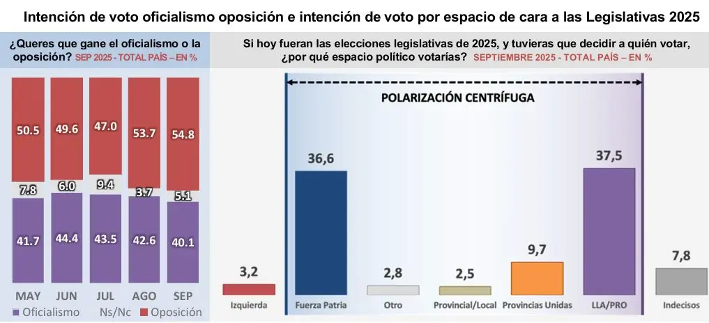 Los sondeos concluidos en septiembre mostraron una nueva caída de Milei en términos de imagen y de gestión. Si bien planteaban un escenario de paridad en voto a nivel nacional, el caso Espert cambiaría la tendencia en PBA.